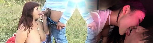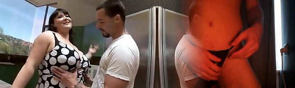 Fat brunette with massive milk jugs likes to suck man rod and get it from the back
