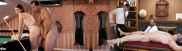 Lucky stud fucks a stunning crimson beauty Kattie Gold at the pool table.