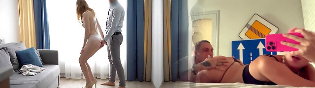 Small redhead babe in sexy silk dress and high heels riding big schlong! Huge cumshot