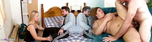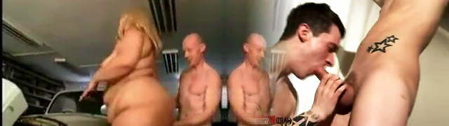 Fat blonde with xxl saggy mounds stumbles onto a BBC porn set