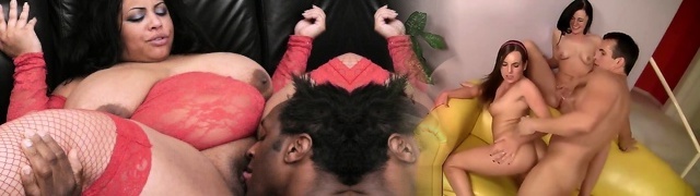 Busty plus-size in red lingerie takes black meat