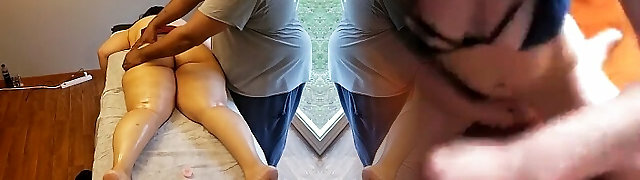 Massagist Fingering her Big White Immense Ass While his Husband Call her in Phone!