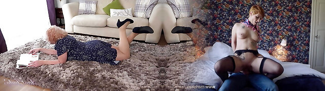 Red-haired Anita M. wearing nylon stockings giving a nice titjob