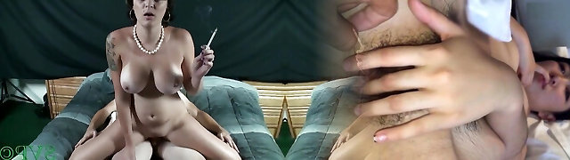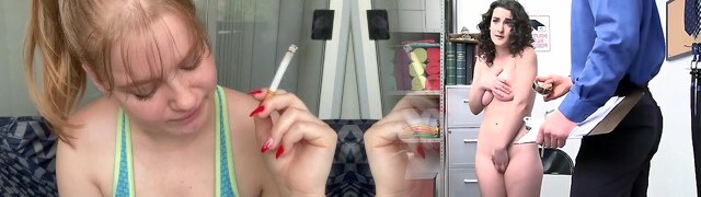 Sexy smoking molten brunette with big melons and a fat rounf ass