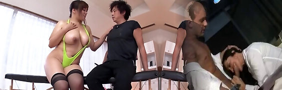 Busty brunette babe Anri Okita gets spoke into poking with a friend