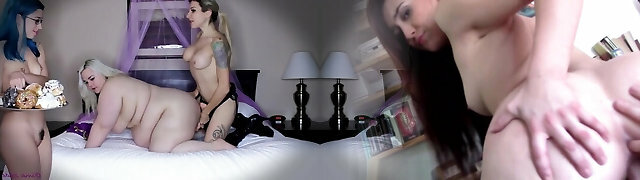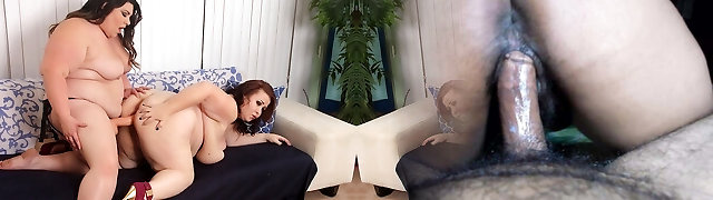 Busty BBW Lezzies giving their girlfriend strapon DP