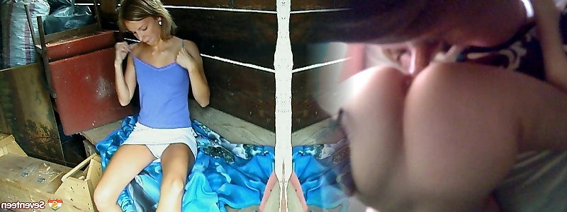 Light-haired honey fuckbox fingers in shed after firm work in garden