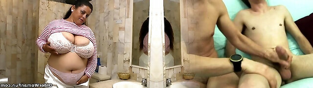 Mature is fucked in the bathroom by her stepson
