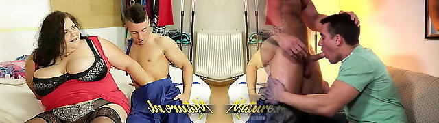 Mature bbw gets her hairless pussy railed by two guys