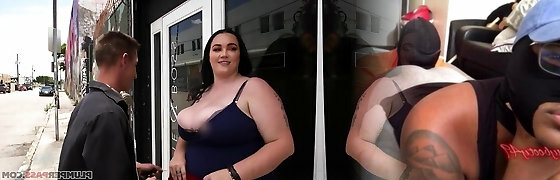Brown-haired Plumper gets her pussy fucked by tattooed guy in public