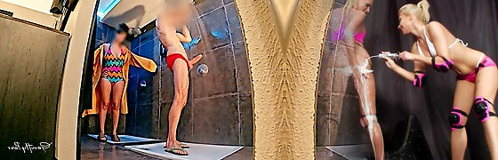 Combined RESTROOM ADVENTURE: dickflash and exhibitionism for two sluts at swimming pool wc