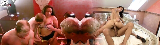 Lucky Grandpa Is Having a Reverse Gangbang with Four Chubby Fucksluts