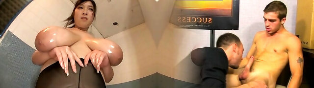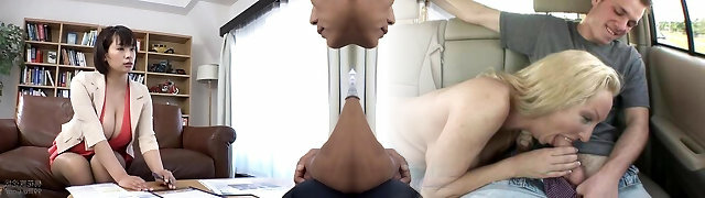 Big titted Japanese office superslut Mari Motoyama works on two cocks at once