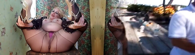 Beautiful bbw mature lady in pantyhose shows her big milk cans and hairy vag.