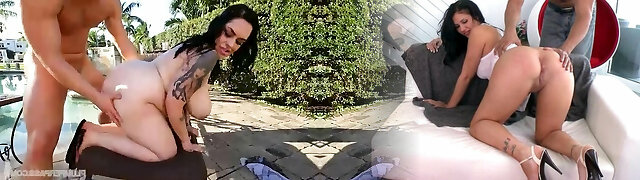 Hefty brunette, Sofia Rose is having casual sex next to the swimming pool, during the day