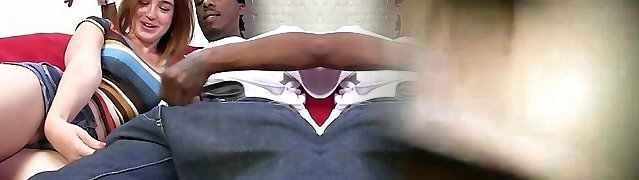 Enormous hair redhead sucks on fat cock and gets fucked from behind on couch